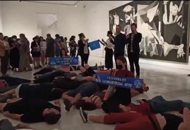 În imaginile şi într-un videoclip postate pe reţelele sociale, mai mulţi activişti stau întinşi pe podea, imitând poziţia unui cadavru, în faţa capodoperei lui Picasso, inspirată de raidul aerian sângeros asupra oraşului Guernica din timpul Războiului Civil Spaniol.