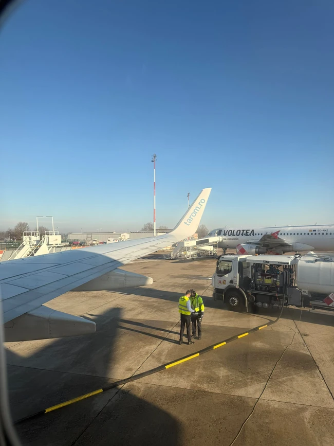 Pasagerilor nu li s-a permis să ne debarce pentru că s-a anunțat că există o valiză suspectă în aeroport. Se așteaptă să fie făcute verificările, echipele de securitate trebuie să stabilească exact despre ce este vorba, ca pasagerii să poată coborî din avion.