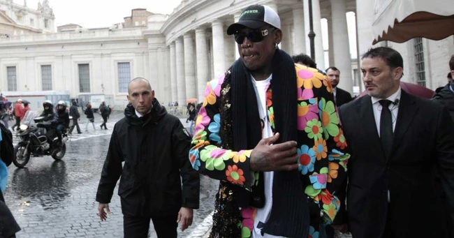 Celebru pentru nonconformismul său, baschetbalistul intenţiona să intre în Piaţa Sfântul Petru într-un papamobil personalizat, însă autovehiculul nu a sosit încă la Roma fiind blocat în nordul Italiei din cauza ninsorilor.