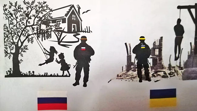 De pildă, într-o ilustrație un soldat rus îngenunchează în fața unui mormânt și a unui steag ce îl înfățișează pe Isus; prin contrast, un soldat ucrainean îngenunchează în fața unui mormânt, dar în prezența unei figură reprezentându-l pe diavol, pe al cărui chip este imprimată o svastică nazistă. În alta, trupele ruse patrulează un sat în care predomină armonia, în timp ce ucrainenii îl ard, fluturând steaguri naziste în timp ce execută copii.