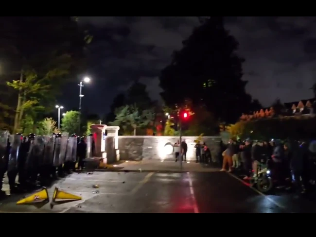 Aceştia au fost înlocuiţi apoi cu unitatea de ordine publică, ai cărei membri aveau scuturi de plastic şi echipament suplimentar de protecţie, după ce ofiţerii din cordonul iniţial au fost loviţi cu obiecte, pietre şi artificii.