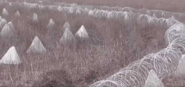 Șiruri de dinți de dragon, structuri de beton menite să blocheze tancurile și vehiculele blindate, sunt acoperite cu spirale de sârmă ghimpată în această zonă.