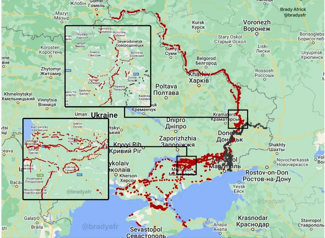 Brady Africk, expert la American Enterprise Institute, arată, analizând imagini prin satelit, faptul că rușii continuă să construiască fortificații pentru a-și întări apărările în teritoriile ocupate.