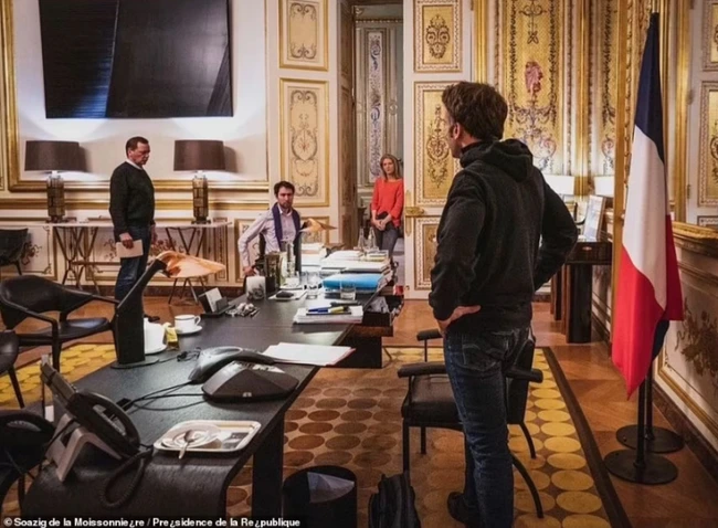 Emmanuel Macron este de nerecunoscut după ce au apărut imagini cu el aşezat la biroul său din Camera Aurie a Palatului Élysée neras şi purtând un hanorac negru larg şi blugi. Este prima dată când preşedintele francez, cunoscut pentru stilul său impecabil, întotdeauna purtând sacoul său navy, apare într-o astfel de ipostază.