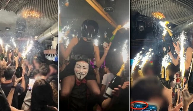 Fotografiile apărute pe rețelele sociale surprind momentul în care femeia misterioasă cu cască neagră este ridicată pe umerii unei alte persoane, ținând artificiile aproape de tavan, ceea ce ar fi declanșat incendiul, potrivit publicației Fakt.