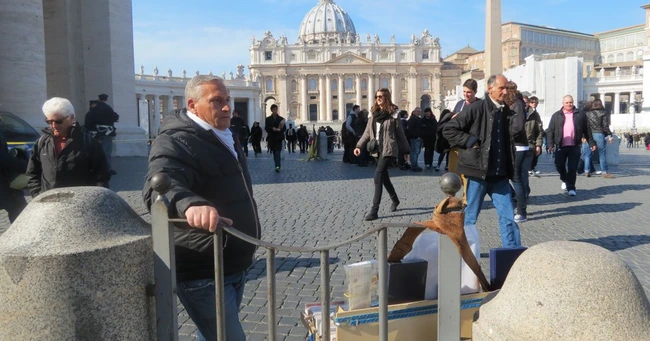 „Cum să am o părere despre demisia Papei? Cine suntem noi să-l judecăm? Asta este între el şi Dumnezeu.” Alfredo Chiarrelli Pallazani Allegrini (58 de ani) nu a avut niciodată un alt loc de muncă. De 35 de ani, poate fi găsit în fiecare zi în acelaşi loc, chiar la mica poartă prin care toţi turiştii intră în Piaţa San Pietro.