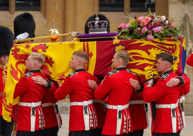 Opt soldaţi din Batalionul I din cadrul Queen's Company Grenadiers Guards vor avea dificila sarcină de a purta sicriul reginei din Westminster Hall până la afetul de tun, apoi de a-l transporta în interiorul Abaţiei Westminster după încheierea procesiunii.