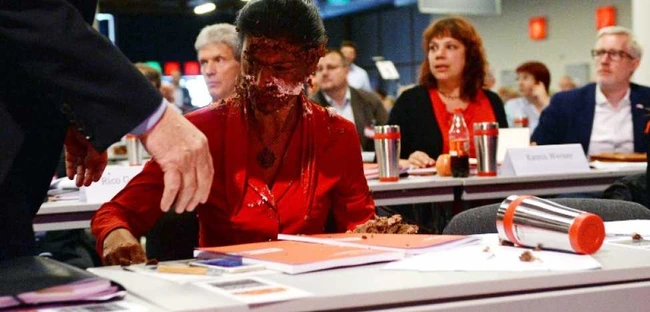 Germania: Şefa grupului parlamentar al partidului Die Linke, lovită în faţă cu un tort de ciocolată VIDEO