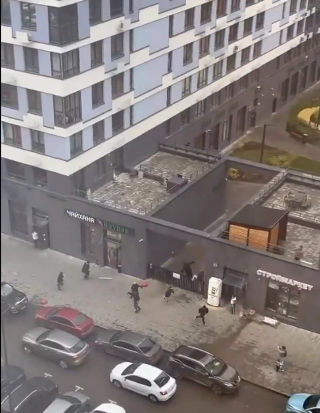 Unii pot fi văzuți sărind peste gardurile încuiate ale grădinii blocurilor, în timp ce alții își vărsau furia în parcarea complexului, lovind parbrizele mai multor mașini. La un moment dat, mai mulți dintre bărbați aruncă armele peste stradă în timp ce urmăresc mai multe persoane.