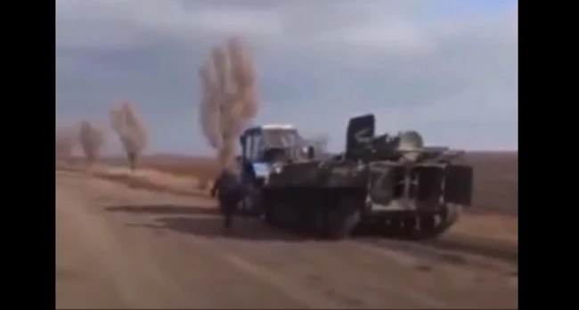 Imagini devenite virale pe internet cu un tanc rusesc furat de ucraineni şi tras cu tractorul - VIDEO