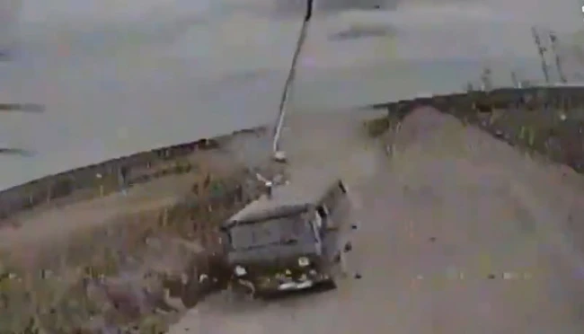 Imaginile arată cum o dronă FPV ucraineană urmărește la propriu o dubă rusească UAZ-452 4x4 off-road, mai bine cunoscută sub numele de Bukhanka, în timp ce aceasta fuge cu viteză, dintr-o parte în alta, în încercarea de a evita drona.
