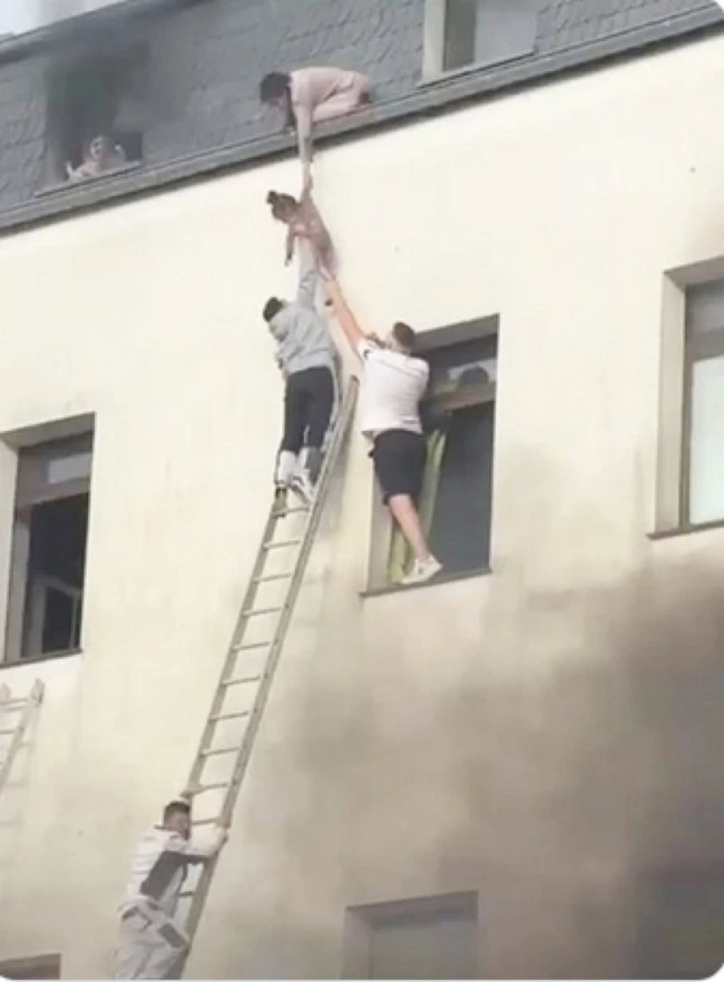 Vecinii au încercat să ajungă sus cu scări pentru a ajuta un copil să coboare, dar acestea erau prea scurte pentru a ajunge la etajele superioare. Întreaga acţiune a fost surpinsă de martori, iar în imagini se vede cum un copil mic, care pare a fi o fetiţă, este suspendat în aer, fiind ţinut de un braț de o persoană, în timp ce se apleacă spre un bărbat aflat pe o scară şi un altul ieşit pe un geam, care se întind să prindă copilul, potrivit DailyMail.