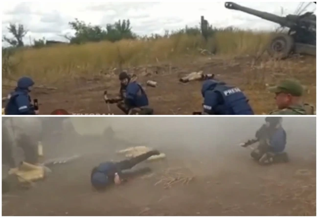 Imaginile surprind o echipă, formată din un reporter, un cameraman şi un tehnician, din Rusia care realizează o transmisiune în direct de pe frontul din Ucraina. Alături de ei se află mai mulţi militari ruşi care manevrează tunul.