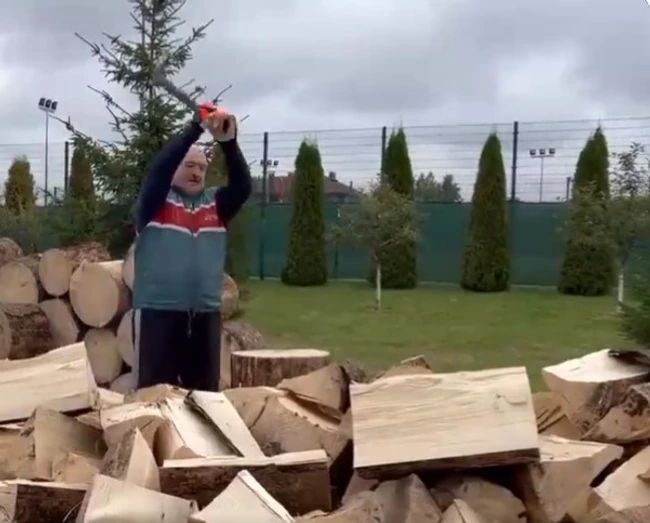 În această înregistrare video, difuzată de televiziune naţională, Lukaşenko poate fi văzut înarmat cu un topor în faţa unui morman de buşteni proaspăt tăiaţi.