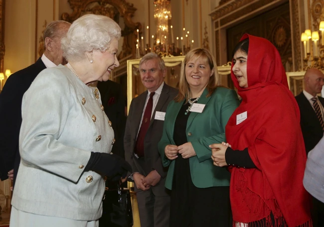 Simbol al dreptului la educaţie, tânăra Malala, acompaniată de tatăl său, Ziauddin, a întâlnit-o pe regina Angliei şi soţul acesteia, prinţul Philip, pe care i-a făcut să râdă în momentul în care a declarat că oamenii din Marea Britanie trimit copii la şcoală pentru a nu pierde timpul acasă.