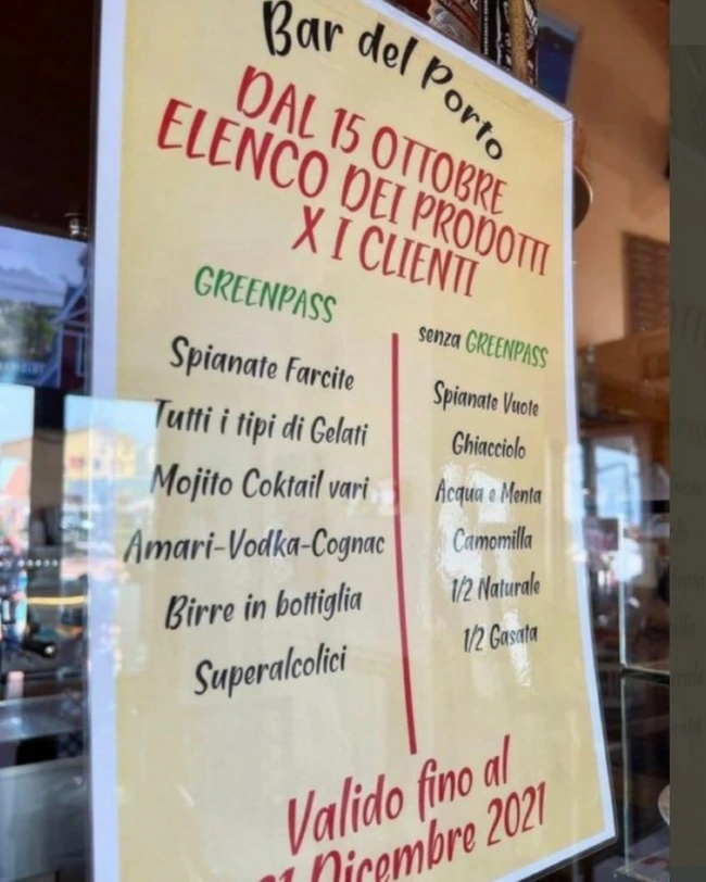 Acesta ar fi oferit vodka, mojito şi cocktail-uri pentru cei care au certificatul verde, dar apă, ceai de muşeţel şi mentă pentru cei care nu au fost încă vaccinaţi anti-Covid. Totodată, el ar fi dat clienţilor imunizaţi un produs de panificaţie umplt cu spanac şi unul fără spanac persoanelor neimunizate.