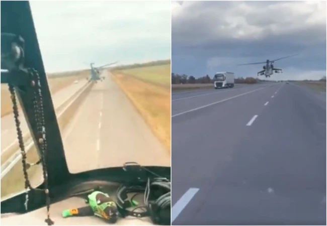 Într-un alt video, un pilot ucrainean zboară intenţionat la joasă înălţime pe o autostradă, riscând să lovească un camion aflat în mişcare.