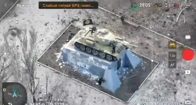 Imaginile arată patru luptători care aleargă spre monument. Aceștia au dat jos un steag ucrainean care era montat pe țeava tancului și au plantat steagul grupului Wagner pe partea de sus a tancului.