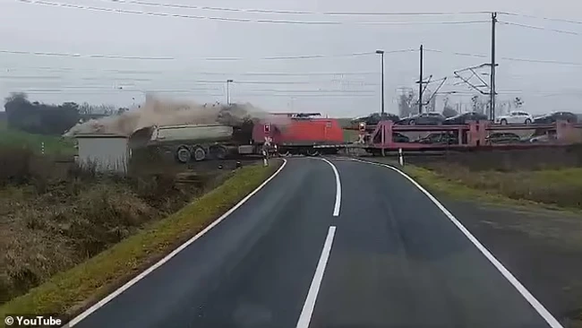 Trenul de marfă, care transporta mai multe mașini Audi noi, a izbit camionul, târându-l cu viteză mare, în timp ce șoferul încerca disperat să frâneze.