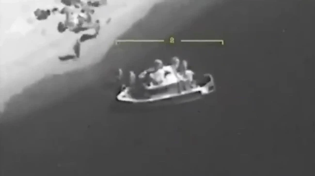 Pe imagini se vede cum un grup de soldați a tras o șalupă la mal și a început să descarce echipamentele, moment în care au fost loviți în plin de un proiectil și aruncați în aer.