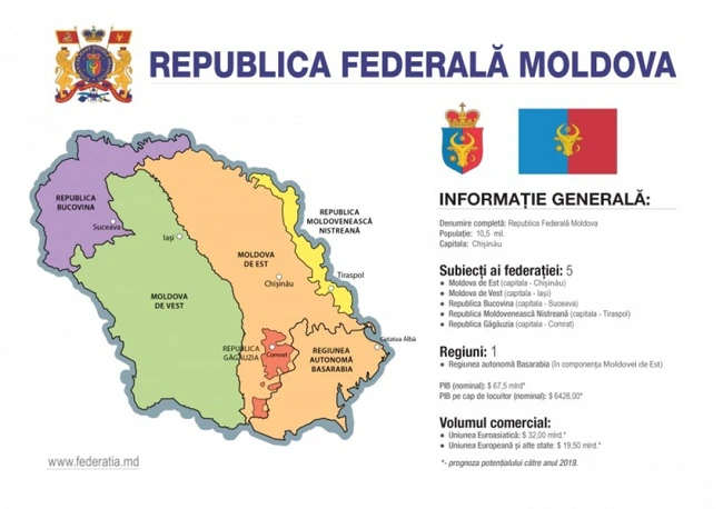 0Mişcarea „Moldova Federativă“, lansată miercuri la Chişinău, propune crearea unei noi ţări, care să cuprindă cinci republici autonome şi o regiune autonomă: Moldova de Est, Moldova de Vest, Republica Moldovenească Transnistreană, Republica Găgăuzia şi Republica Bucovina. În noua structură statală ar urma să intre şi Regiunea autonomă Basarabia.
