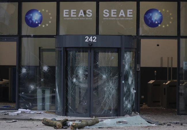 În violenţele care au izbucnit duminică, manifestanţi cu cagule şi mascaţi au spart geamuri ale birourilor Serviciului de Acţiune Externă al Uniunii Europene, principalul organism diplomatic al acesteia. „Intrarea laterală a fost vandalizată", a declarat un purtător de cuvânt al Comisiei, adăugând că nimeni nu a fost în pericol.