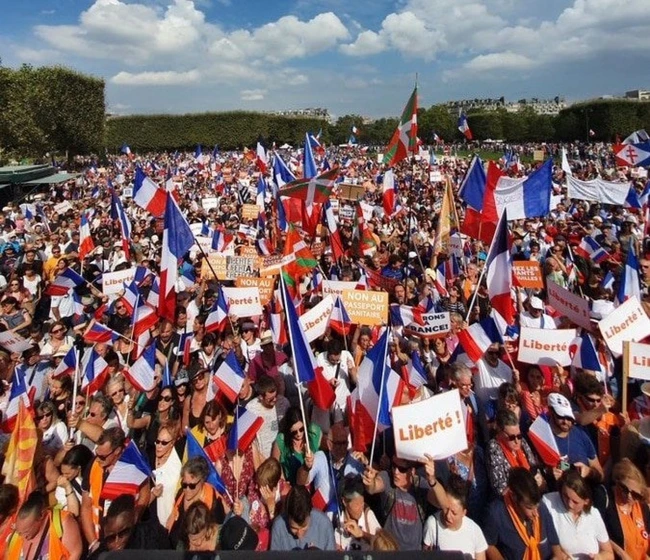 În Rennes (vest), manifestaţii purtau pancarte pe care se afla înscris ''Injecţie ARNm, soluţie pentru depopulare?''. Manifestaţii au avut loc şi la Montpellier, Lyon, Nisa, Lille, Nantes, Bordeaux sau Strasbourg.