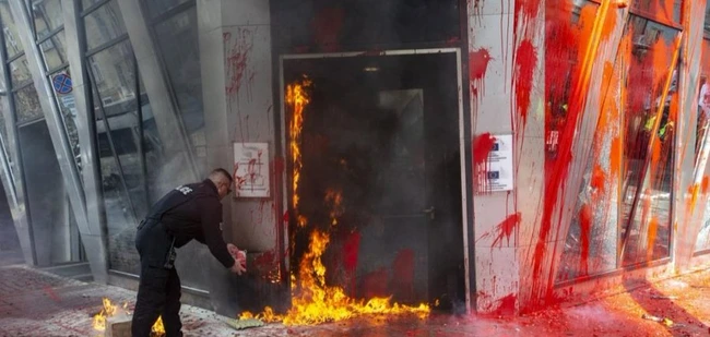 Protestatarii antiguvernamentali, scandând „Demisia” și „Nu euro”, au luat cu asalt clădirea, aruncând cu vopsea roșie, petarde și cocktail-uri Molotov, și dând foc ușii de la intrare înainte ca poliția să intervină, transmite Reuters.
