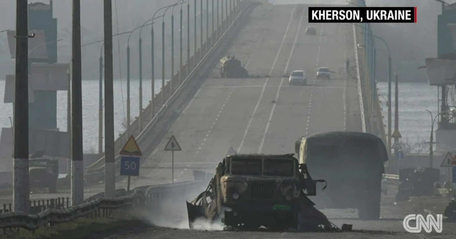Pe reţelele de socializare au apărut imagini cu un convoi militar rus din Herson, sudul Ucrainei, care a fost distrus de forţele ucrainene. Potrivit CNN, martorii au văzut vehicule blindate care traversau podul, spre Ucraina însă informaţiile nu au putut fi confirmate de autorităţi.