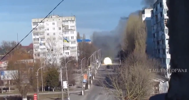 În imaginile publicate pe reţelele de socializare se poate vedea momentul în care un tanc trage chiar în direcţia clădirii în care se afla cameramanul care filma, iar geamurile apartamentului se sparg imediat.