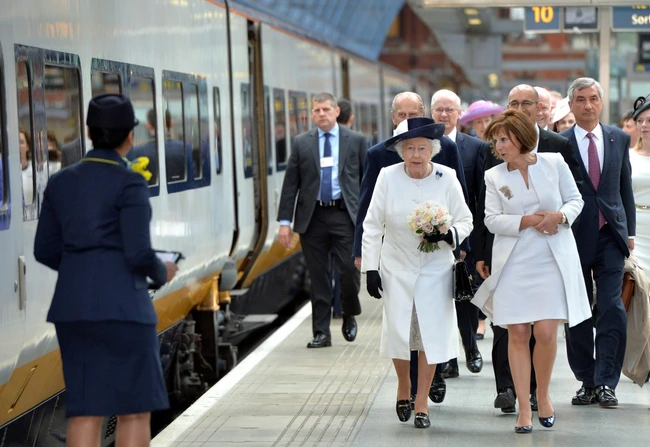 Însoţită de prinţul consort Philip, regina a dezvelit în Gara londoneză Saint Pancras o placă marcând 20 de ani de la construirea tunelului de sub Canalul Mânecii, după care a urcat într-un vagon, imediat după ora 11.00 GMT (14.00, ora României).