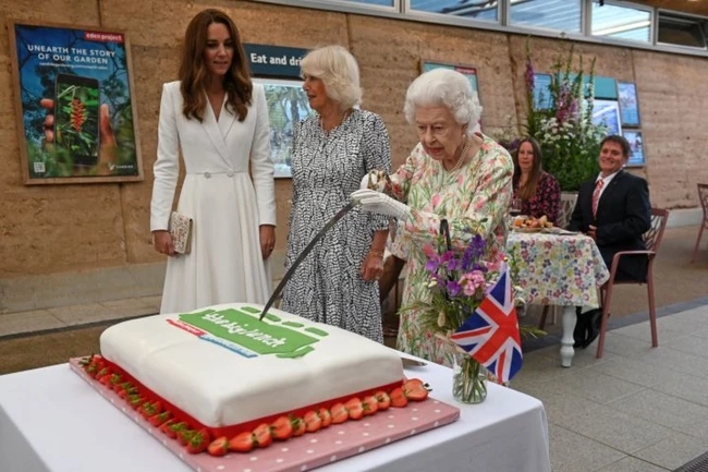 În imaginile care au ajuns virale, regina optează pentru sabie pentru a tăia tortul. O primeşte de la un ofiţer şi încearcă să o folosească, dar aceasta pare prea grea: "Nu cred că va merge...". "Poate dacă folosiţi ambele mâini?", îi sugerează ducesa de Cornwall.