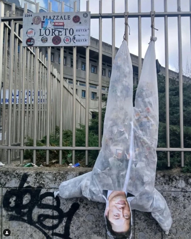 Manechinul, realizat dintr-un sac și având chipul miliardarului decupat și lipit, a fost agățat cu capul în jos de o poartă din Piazzale Loreto.
