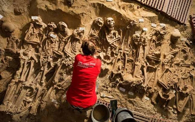 În total, arheologii au descoperit opt morminte, în şapte dintre ele aflându-se câte 20 de cadavre. Ultimul mormânt conţinea peste 150 de schelete, puse unele peste altele.