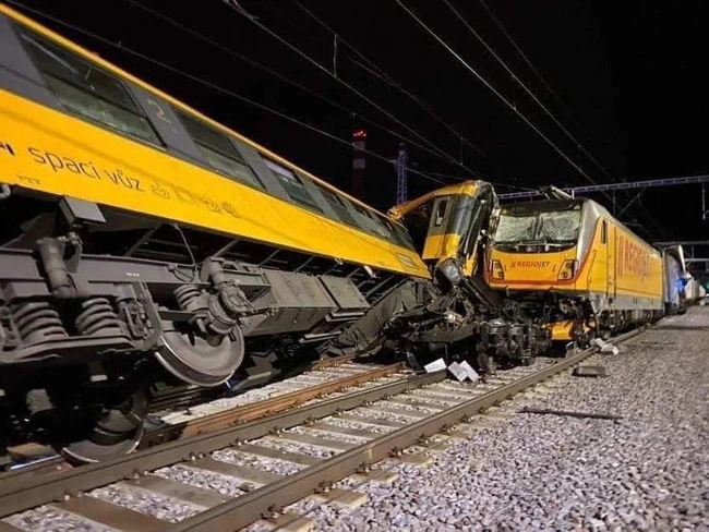 0În Cehia, cu puțin înainte de miezul nopții, trenul de pasageri RegioJet 1021 care se îndrepta spre Ciop, Ucraina, a intrat în coliziune cu un tren de marfă ČD Cargo în apropierea stației din orașul Pardubice.