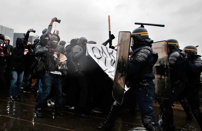 După manifestaţia sindicală împotriva legii muncii de joi, forţele de ordine au luat cu asalt câteva sute de manifestanţi tineri, veniţi să se confrunte cu poliţiştii, care împiedicau accesul în centrul oraşului.