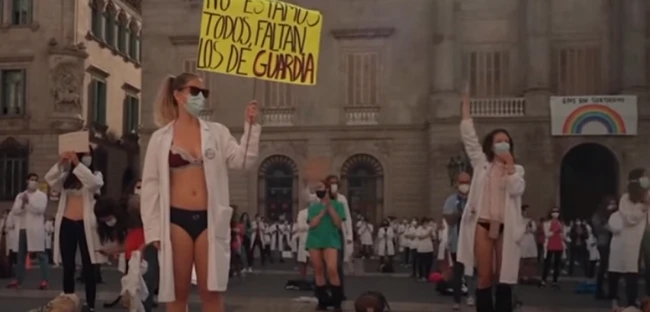VIDEO Ajunşi la epuizare, medicii rezidenţi din Barcelona s-au dezbrăcat în stradă