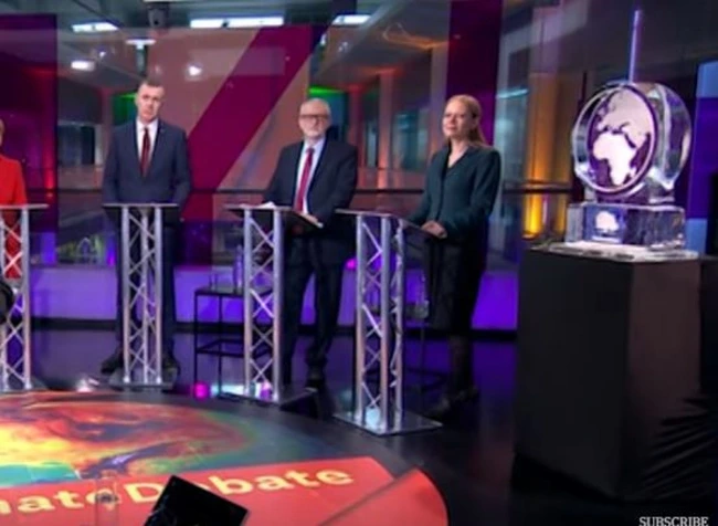 Boris Johnson a refuzat să participe, iar Channel 4 l-a înlocuit cu un bloc de gheaţă, cu sigla Partidului Conservator (Tories) care s-a topit puţin câte puţin, ilustrând încălzirea globală.