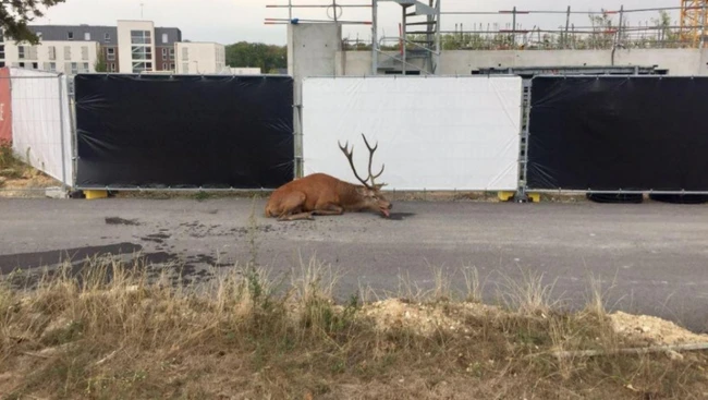 0Cerbul a fot urmărit de vânători şi câini până a ajuns într-un şantier din apropierea pădurii. Cerbii pot muri din cauza efortului şi a stresului.