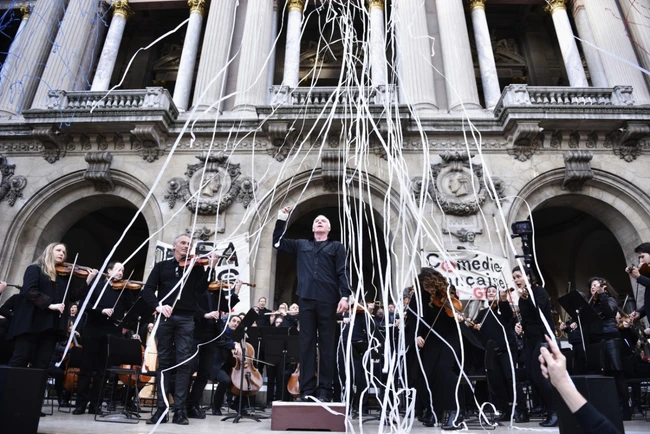 În faţa a numeroşi parizieni şi turişti, dar şi a angajaţilor în grevă, orchestra şi corul Operei din Paris au interpretat extrase din “Les Troyens”, opera lui Berlioz, “Trubadurul” lui Verdi, “Carmen” de Bizet şi au încheiat cu Marseilleza, în aplauzele mulţumii, care a scandat “Trăiască greva!” şi a aruncat cu confetti.