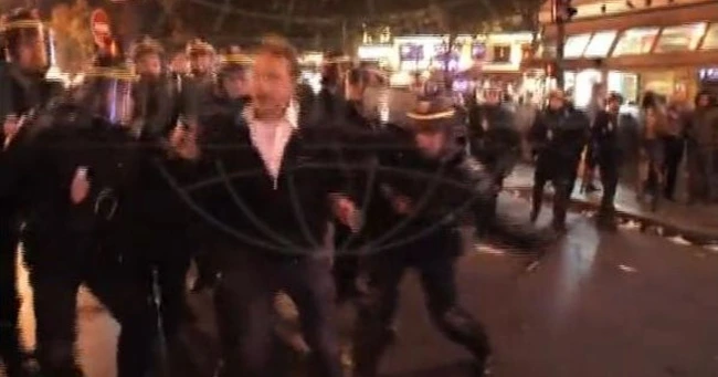 Într-o acţiune de retragere a Poliţiei, jurnalistul a fost îmbrâncit de forţele de ordine. El a strigat: "Sunt jurnalist!" dar jandarmii l-au prins, i-au dat câteva bastoane peste picioare şi l-au doborât la pământ. În tot acest timp, jandarmii i-au ameninţat cu spray paralizant pe cameramanii care filmau. După ce s-a ridicat, reporterul le-a arătat jandarmilor Carta de Jurnalist, documentul care atestă profesia de reporter în Franţa. A fost din nou îmbrîncit şi dat la o parte. La final, un bărbat care a asista la incident îi spune jurnalistului: "Nu îi mai înfrunta, pentru că sunt nişte criminali!".