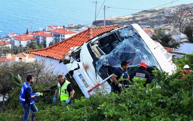 Momentul în care autocarul cu turişti se rostogoleşte şi se opreşte apoi într-o casă a fost înregistrat de o cameră de supraveghere. 29 de oameni au murit în acest accident care a avut loc miercuri pe isula portugheză Madeira.