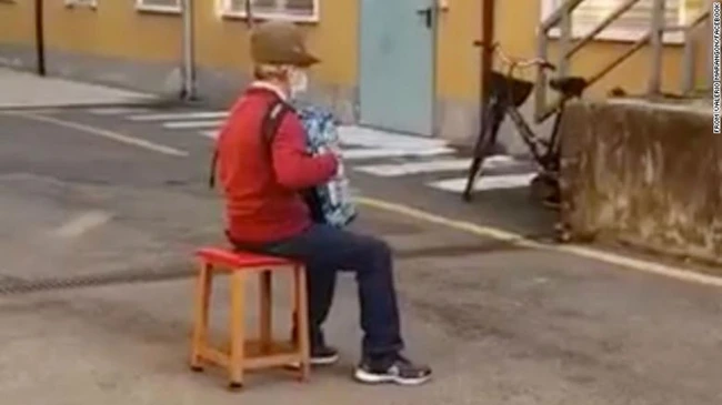 În timp ce Carla Sacchi, soţia sa de 47 de ani, privea de la fereastra de la etajul al doilea al spitalului din Castel San Giovanni, un oraş din regiunea Emilia-Romagna din nordul Italiei, Bozzini, purtând un pulover roşu, pantaloni bleumarin, o pălărie cu pene şi o mască, i-a cântat cântece de dragoste la acordeonul său, relatează CNN.