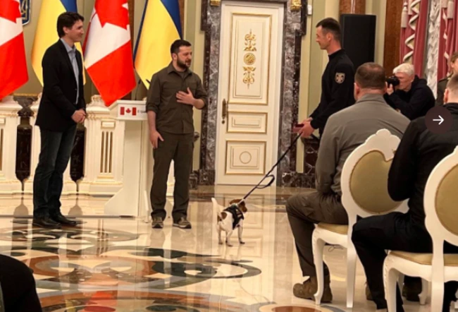 În timpul conferinţei la care a luat parte cu premierul canadian, Justin Trudeau, Zelenski i-a înmânat lui Patron şi lui Mihailo Iliev, proprietarul câinelui, premiul de stat "Pentru servicii dedicate".