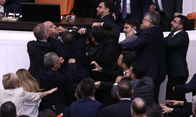 0A fost haos, vineri, în parlamentul turc, după ce zeci de deputați au luat parte la o bătaie în timpul unei dispute cu acuzații grele pe tema încarcerării unui parlamentar de opoziție căruia i-a fost retrasă imunitatea parlamentară în acest an.