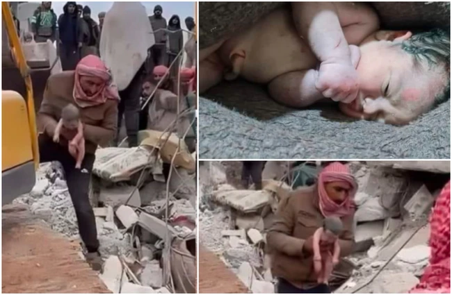 Într-un clip video, care a fost publicat de un jurnalist sirian pe Twitter, a fost surprins momentul în care un bărbat iese cu nou-născutul salvat de sub ruine și îl încredințează echipajelor de salvare.