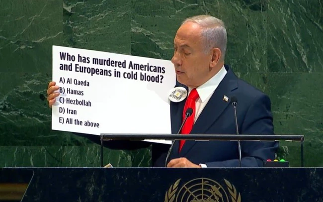 Prim-ministrul israelian Benjamin Netanyahu a folosit recuzită, hărţi şi teste grilă în timpul discursului său de la Adunarea Generală a Naţiunilor Unite.
