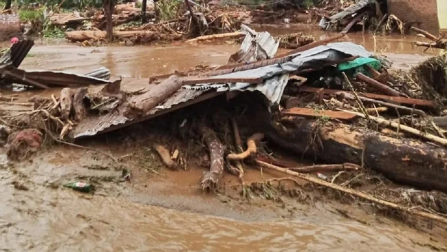 În fotografiile difuzate de agenție, acoperișuri și copaci au fost văzute împrăștiate pe terenul plin de noroi, sub o ploaie puternică.