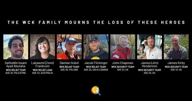 World Central Kitchen (WCK), fondată în 2010 de bucătarul spaniol Jose Andres, a transmis într-un comunicat că Chapman, Henderson şi Kirby erau membri ai echipei sale de securitate.
