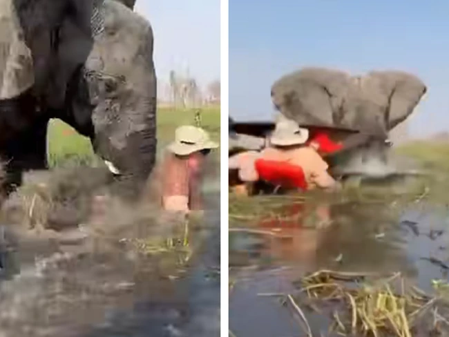 În imaginile publicate pe rețelele sociale se poate vedea cum ghizii încearcă disperați să se îndepărteze de elefanții furioși, pe măsură ce unul dintre aceștia folosește trompa și colții pentru a răsturna canoele.